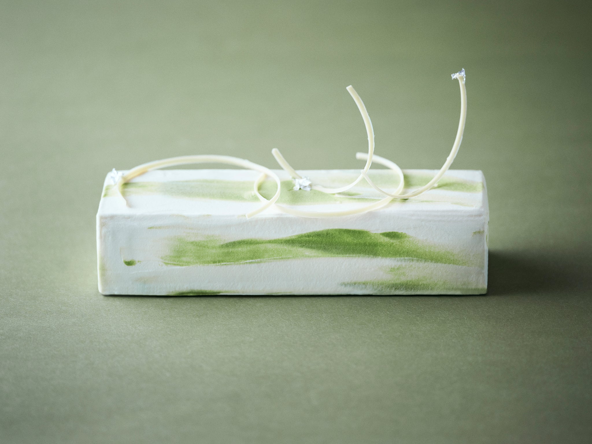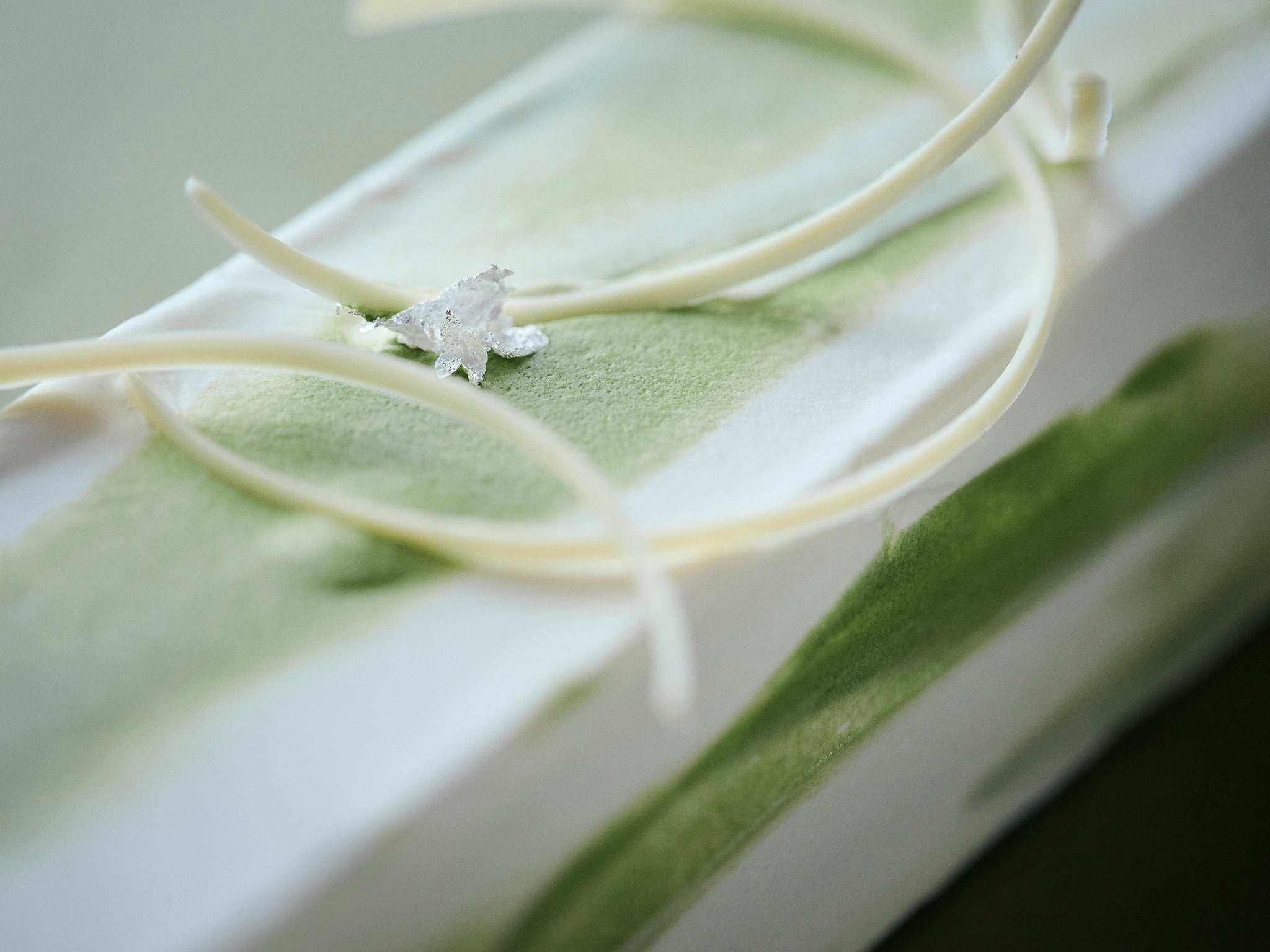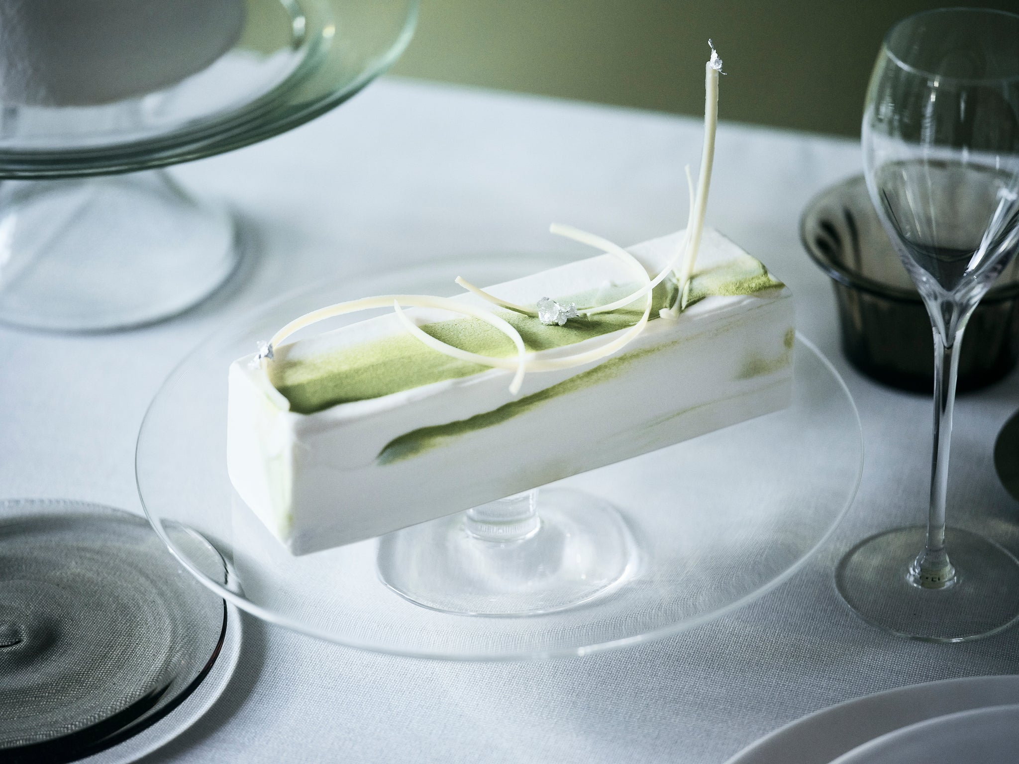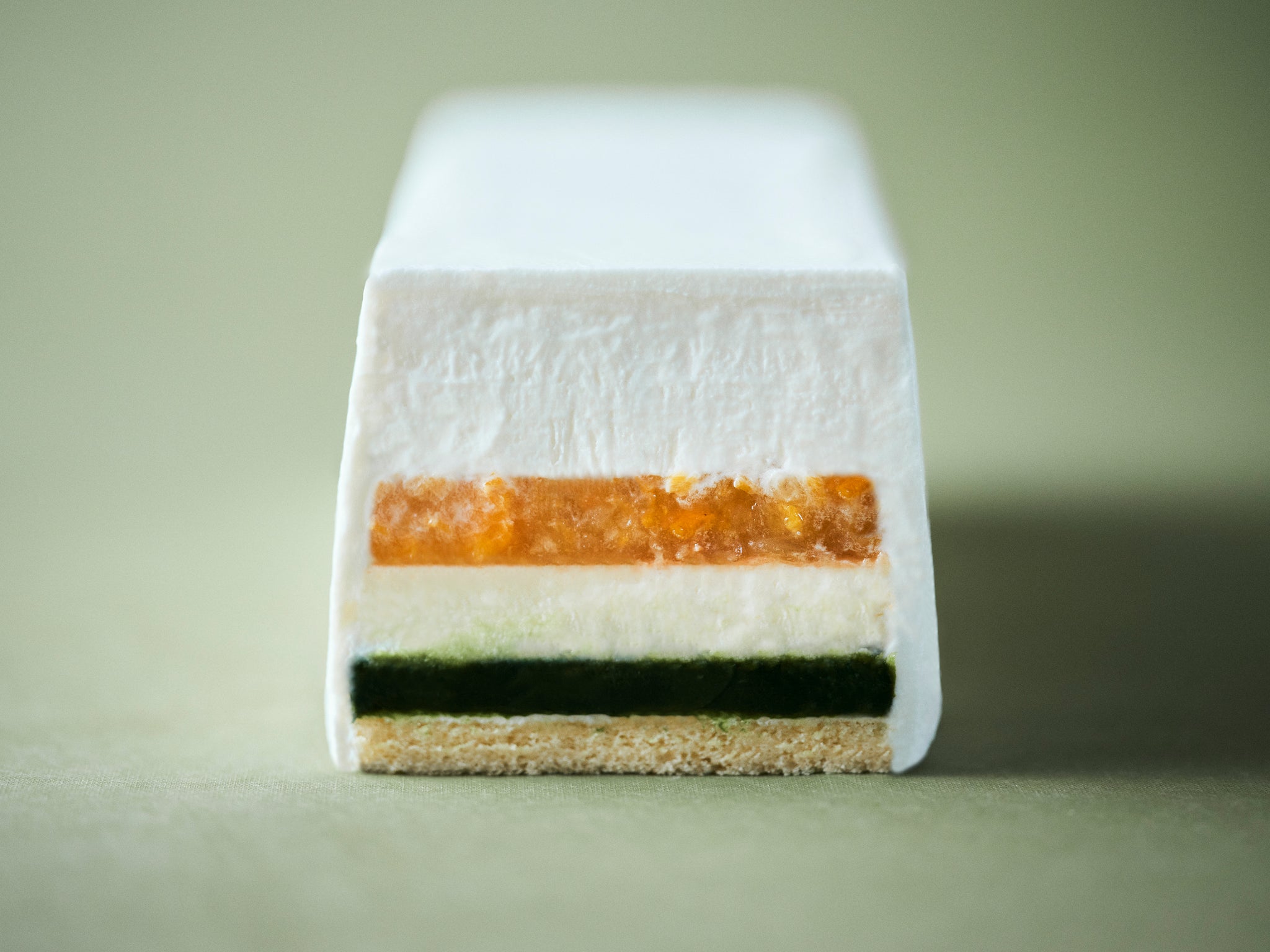オーガニックアーモンドを加えた軽やかなビスキュイに、北海道よつ葉乳業のチーズで焼き上げたベイクドチーズ、愛媛県産の柑橘を使用したジュレとレアチーズムースを重ね、ほろ苦い抹茶ソースをアクセントにしました。