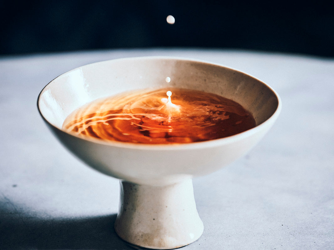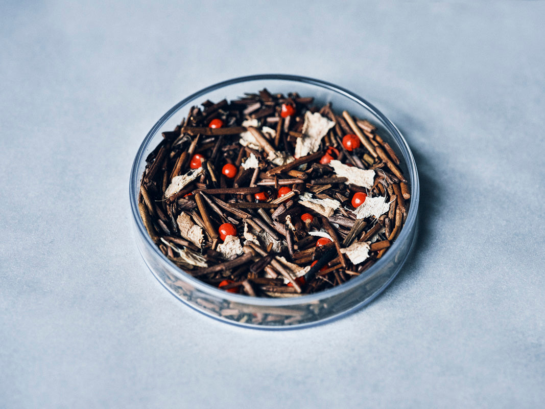 冬のはじまりを告げる霜の朝。香ばしく甘みのある焙じ茶に生姜と赤胡椒のぴんとした清らかさが走り、凍える空気のなかであたたかさがほどけていくよう。