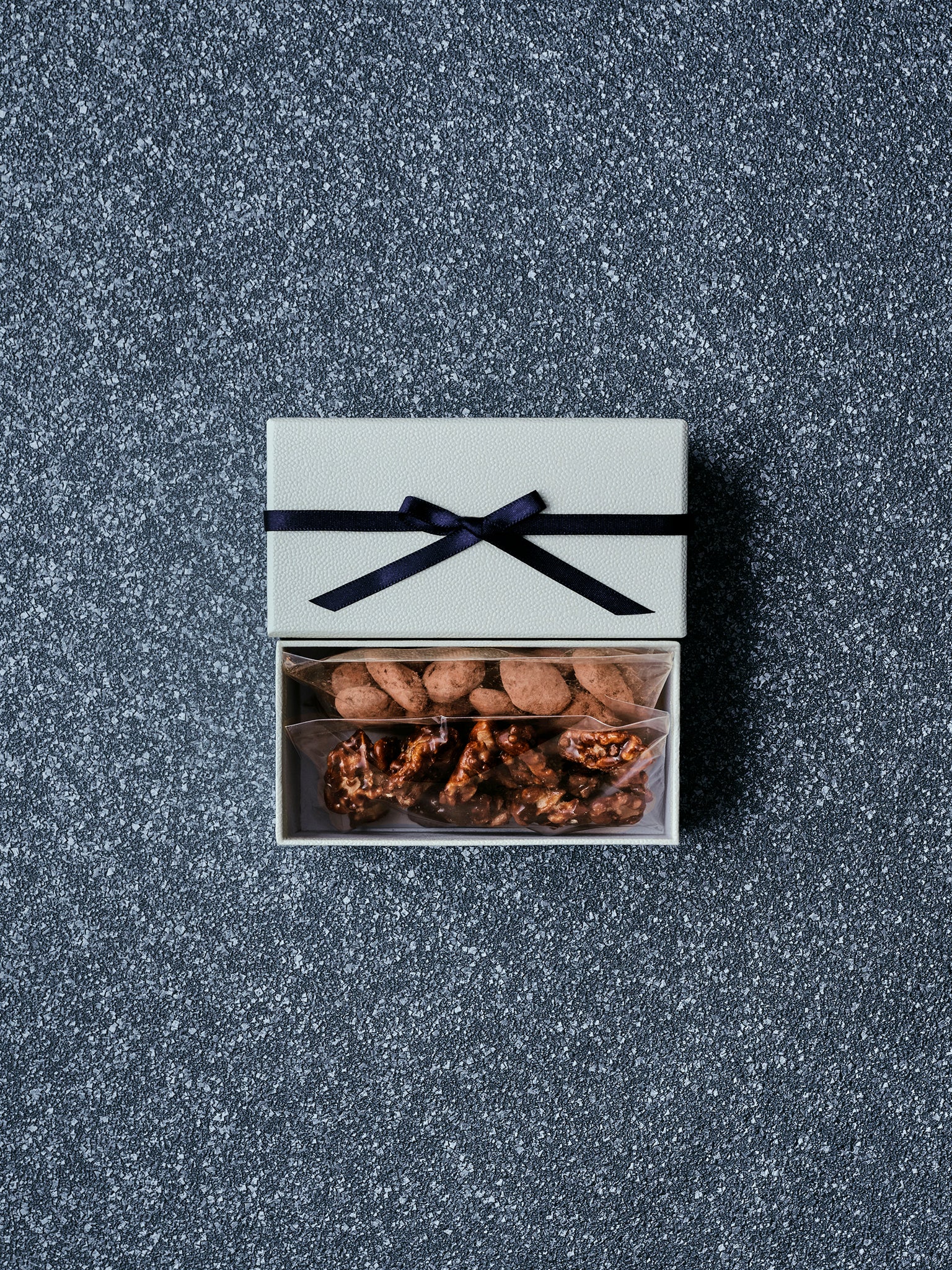 キャラメルの苦味と甘み、ナッツの油分と旨み、そしてチョコレートの余韻。素材の個性を活かしながら、異なる方向性の二種を一箱に詰め合わせました。
